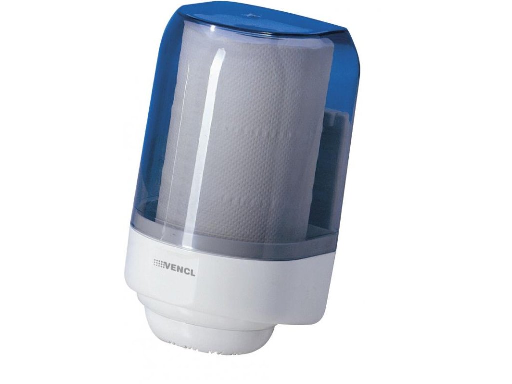 Nástenný zásobník na papierovú rolku so stredovým odvíjaním priemer 140 mm a výška 220 mm, biely ABS plast / transparent. Rozmery 185x166x293 mm