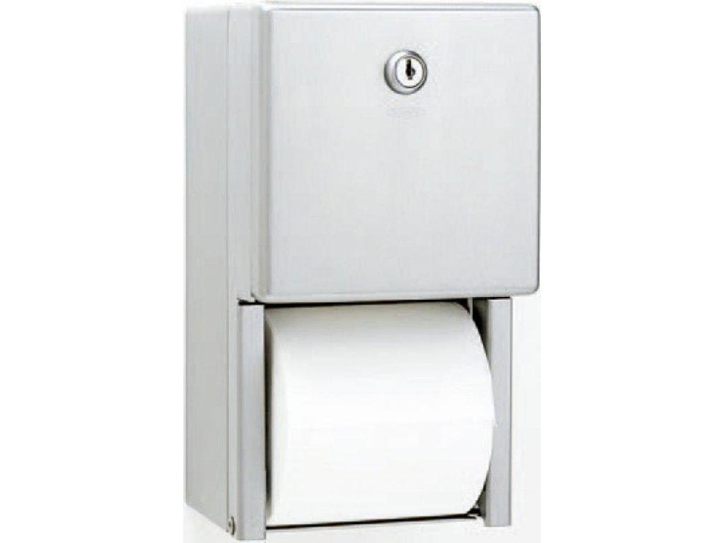 Nerezový zásobník na 2 štandardné rolky toaletného papiera, nástenný. Po spotrebovaní spodnej rolky poistný mechanizmus uvoľní hornú, ktorá spadne do spodnej polohy, 150x155x280 mm