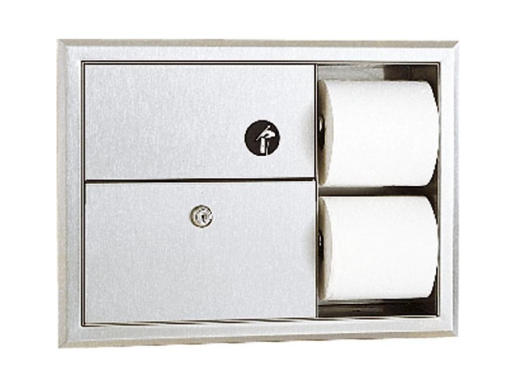 Nerezový zásobník na toaletný papier & hygienický kôš 2,8 l, vstavaný. Rozmery: vonkajšia časť: x435x325 mm, vstavaná časť: 100x385x275 mm. Výklopné veko, uzamykateľný.