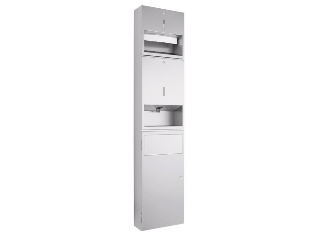 Kombinácia pozostávajúca z dávkovača tekutého mydla, dávkovača papierových utierok a odpadového koša v robustnej, antimikrobnej a ľahko udržiavateľnej nehrdzavejúcej oceli (AISI 304). Celý plášť z nehrdzavejúcej ocele; všetky rohy plne zvarené, viditeľné plochy matne upravené a brúsené. Ďalšie dostupné povrchy: pozrite nižšie. - Dávkovač tekutého mydla s dávkovačom na jedno ovládanie a bezodkvapkávajúcou pumpou . - Navrhnutý pre štandardné 950 ml obaly jednorazového tekutého mydla alebo krému na ruky. Alternatíva s dávkovačom mydlovej peny pod kódom WP510-5. Alternatíva s bezdotykovým dávkovačom pod kódom WP510e. Možnosť opätovného naplnenia veľkým kontajnerom pomocou zasúvacieho zásobníka ako voliteľnej možnosti. Dávkovač papierových pre približne 250 štandardných papierových utierok skldaných. Veľkosť papiera (zložené): 240-250 mm x 100-115 mm. - Kontrolné otvory na indikáciu úrovne naplnenia. - Prístupný na doplnenie cez zámkovú prednú klapku s ochranou proti pádu. - Odpadkový kôš vybavený vyberateľným sieťovým košom. Kapacita približne 11 l. Prístupný cez zámkové dvere s automaticky sa zavierajúcou, ohňovzdornou klapkou na vyhadzovanie. Na objednávku možné pripraviť v akejkoľvek farbe škály RAL.